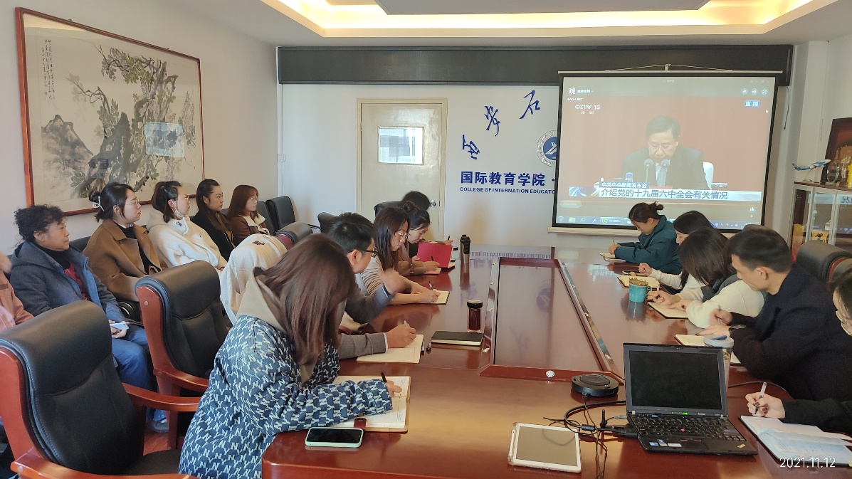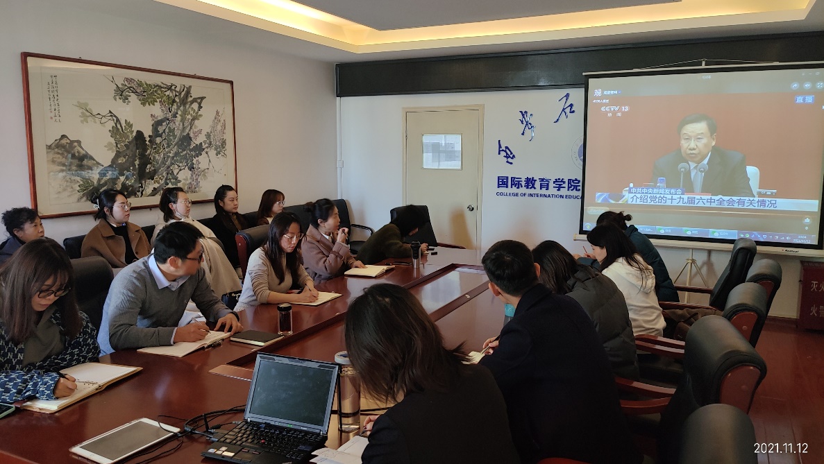11月12日上午,在第二教学楼801会议室,美加墨世界杯官方网站组织全院教工在线收看党的十九届六中全会新闻发布会直播。全公司党群21人参加学习。