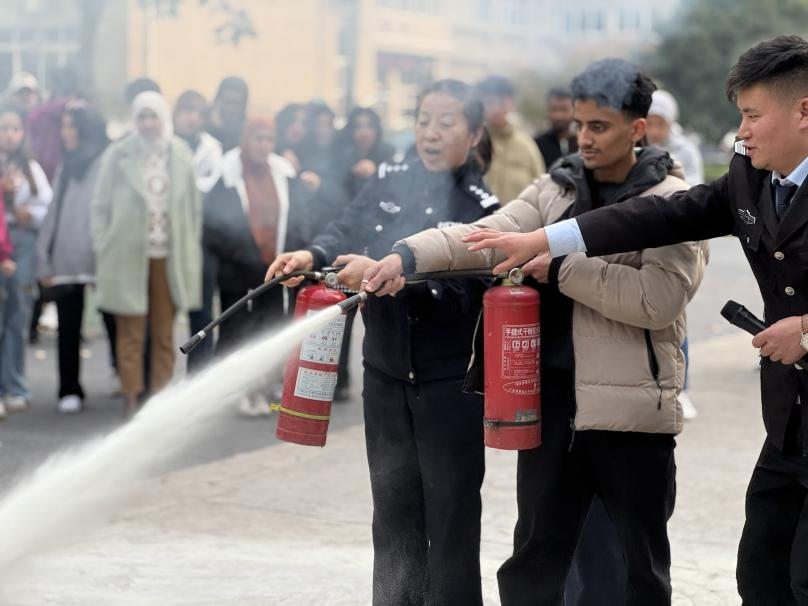 宣讲会后进行逃生演练环节,在工作人员的引导下师生们捂紧口鼻,弯腰下楼,快速撤离至安全区域。随后的灭火演练环节,王浩淳向国际员工演示了干粉灭火器使用方法,经指导后现场国际员工掌握了灭火技能,并拿起灭火器进行了实际操作。